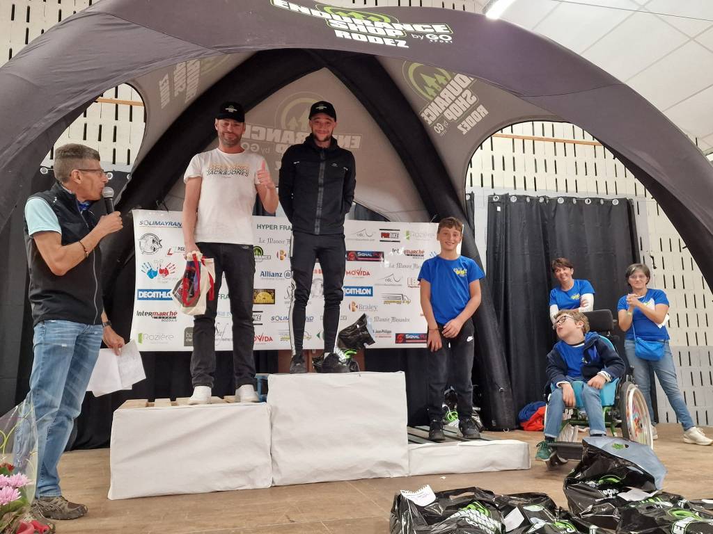 La seule règle : les deux coureurs doivent systématiquement passer la ligne de départ ensemble, la main du coureur à pied sur l’épaule du coureur VTT.